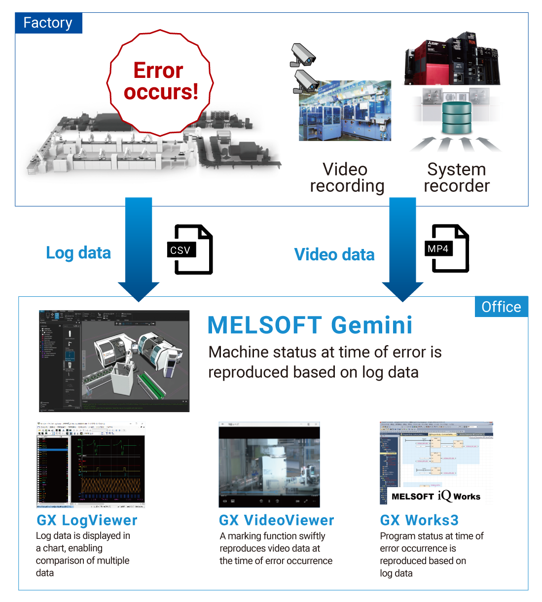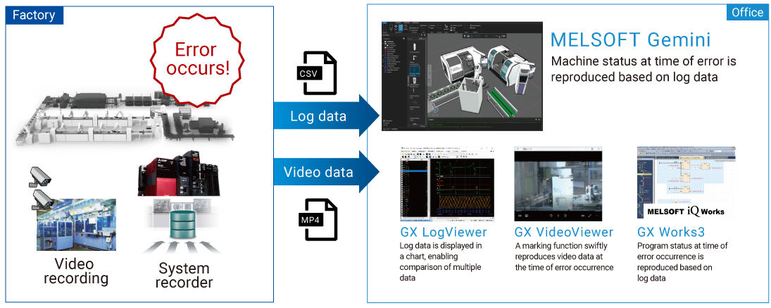 Equipment operations can be reproduced in. MELSOFT Gemini based on log data and troubleshooting can be performed remotely,