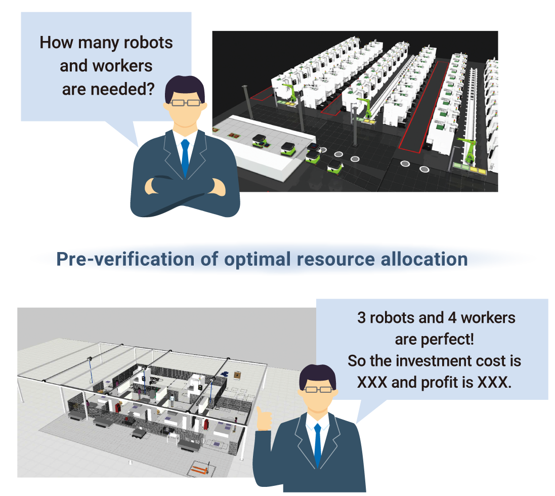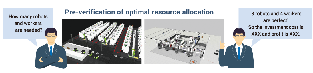 When installing new production equipment or expanding existing lines, verification via simulation of multiple patterns makes it possible to grasp the necessary number of robots, processing machines and AGVs, as well as the necessary number of workers, thus enabling the trial calculation of optimal investment cost.
