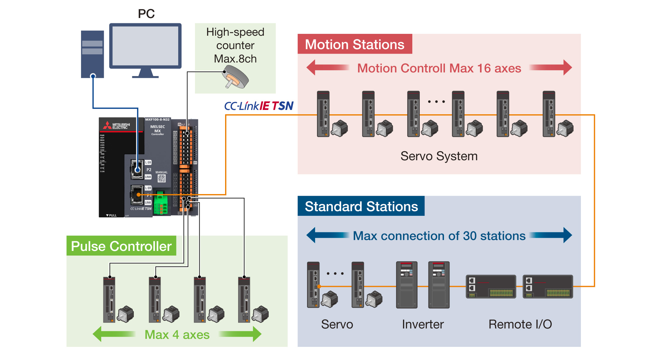 - Fitur CC-Link IE TSN yang terintegrasi memungkinkan pengendalian hingga 16 stasiun gerak dengan sinkronisasi secepat 250 mikrodetik.