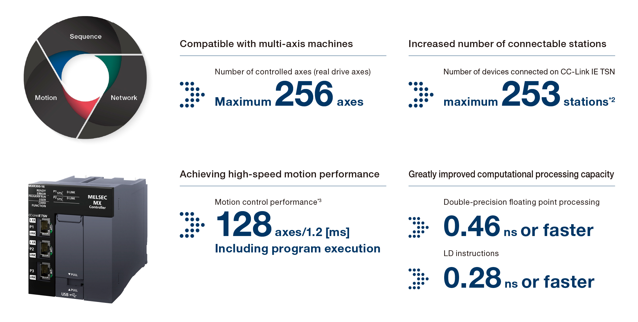Semua fungsi urutan, gerakan, dan jaringan terintegrasi. Kinerja kontrol gerakan sekitar 10 kali lipat.*1 higher than existing products of Mitsubishi Electric, achieving high-speed and highaccuracy motion control.