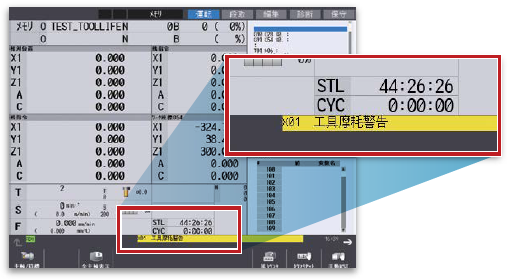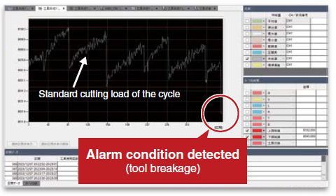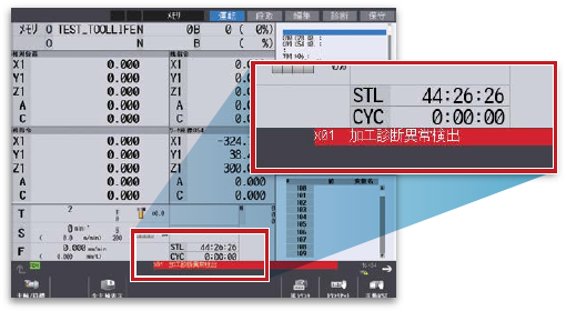 NC MachiningAID automatically identifies the feature associated with tool wear from the features of each axis and the correlation between the tool usage, then automatically learns the tool life on a process-by-process basis. Once trained, the NC MachiningAID predicts the tool deterioration (erosive wear) on a machining-by-machining basis, and when the tool is nearing the end of its life, it indicates a corresponding CNC alarm message to organize the user to change the tool.