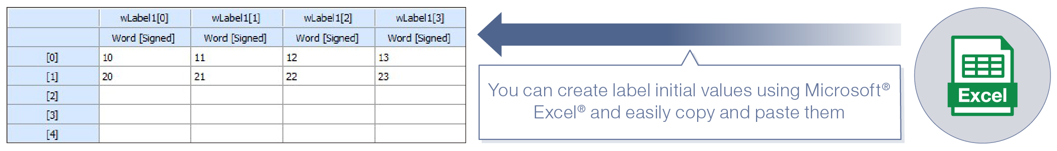 You can set initial values for array elements and structure instances on the label editor. This eliminates the need for initial value setting programs, reducing the program capacity and the scan time.