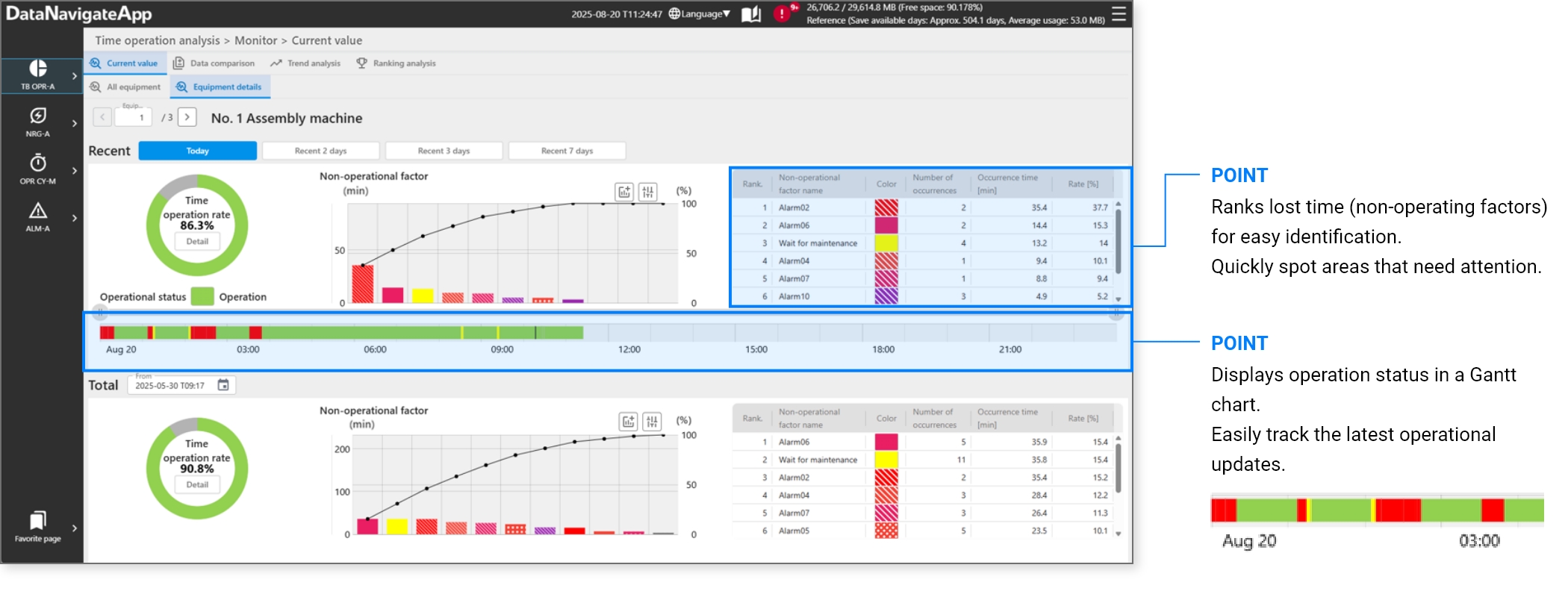 Visualizes and analyzes equipment status (operating, stopped, non-operating, etc.).