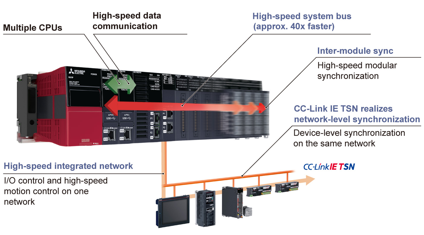 - The high-speed system bus is approx. 40-times faster compared to existing models, achieving very fast and large-capacity data processing between CPU modules or network modules