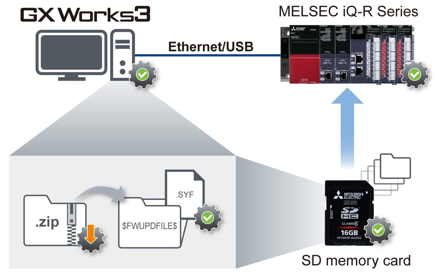 - Update is possible using the engineering software GX Works3 or an SD memory card