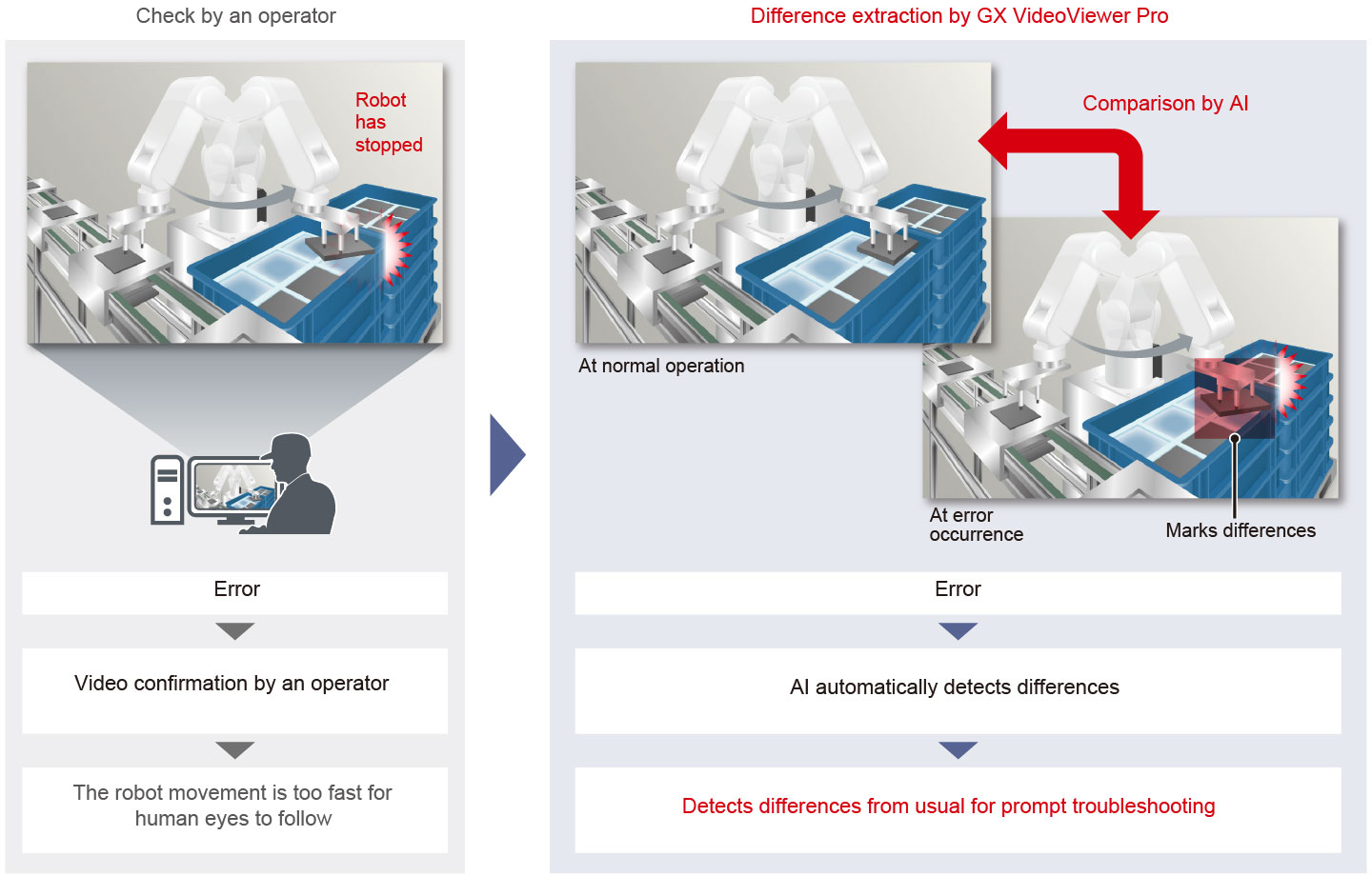 - In coordination with the camera recorder module and engineering software GX VideoViewer Pro, differences from normal patterns are extracted according to changes in “appearance (color, shape, position, etc.)” and “operation (amount of travel in unit time, etc.)”, then marked on the video feed automatically