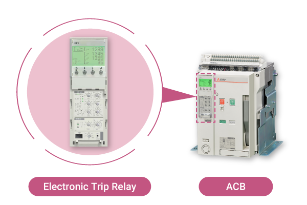 A trip relay is an electronic circuit which outputs the trigger signal that activates the ACB open/close mechanism when the trip relay detects applied current that exceeds the set value.