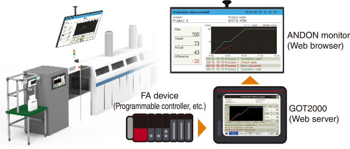 iQ Monozukuri ANDON is an application package that enables an ANDON system to be built with GOT2000 Series.