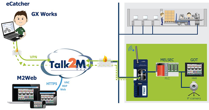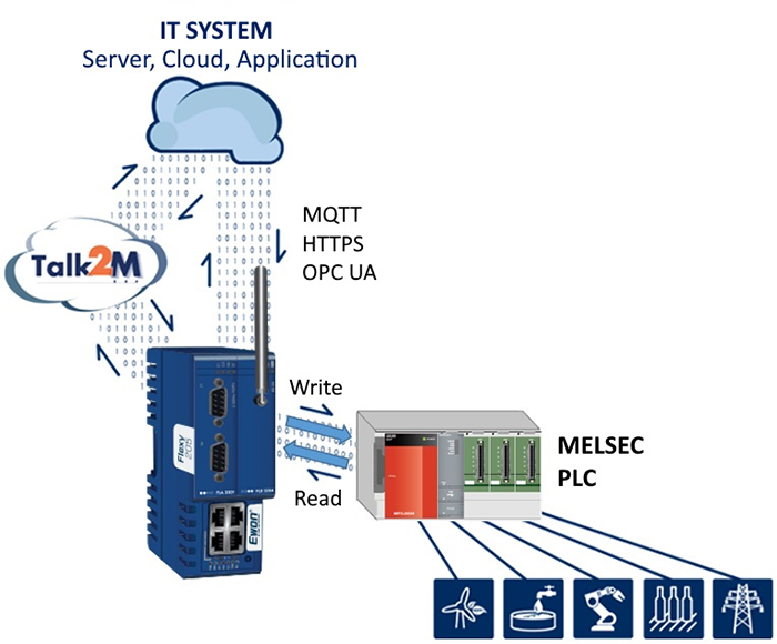 With embedded SLMP and MC Protocol connectivity, the Flexy 205 allows data collection from MELSEC PLCs easily. Data can then be used for trend analysis, logging, alarms, building local dashboards, or send to factory business intelligence software, MES, or ERP systems via OPC UA. Data never leaves the factory floor, unless user wants it to be. The gateway can connect securely to Talk2M, our secure industrial cloud, or any Private or Public Cloud. The requests from the Flexy 205 gateways are executed via MQTT or HTTPS protocols, standards widely deployed in the IT industries. Find out more from https://www.ewon.biz/products/ewon-flexy Open new window
