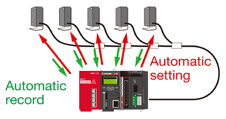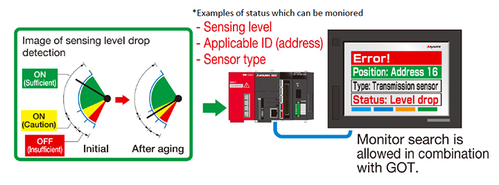 Anywire brand sensors which sensor function and I/O terminal function are combined in an identical sensor device can directly connect to transmission cable without any I/O terminal. It is an ultimate style of wiring-saving which you can not eliminate anything. Besides, preventive maintenance with the sensor is possible because not only ON/OFF status but also its sensing level can be monitored in real time. It also enable to reduce adjustment steps and man-hours by setting sensitivity, threshold and parameters at a upper controller or a display.