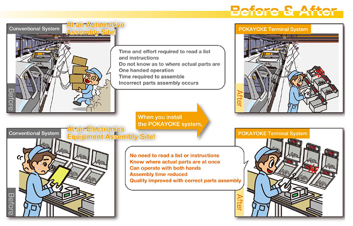 - As the location of parts is informed by LED lamps, parts can be clearly identified even in a dark warehouse.
