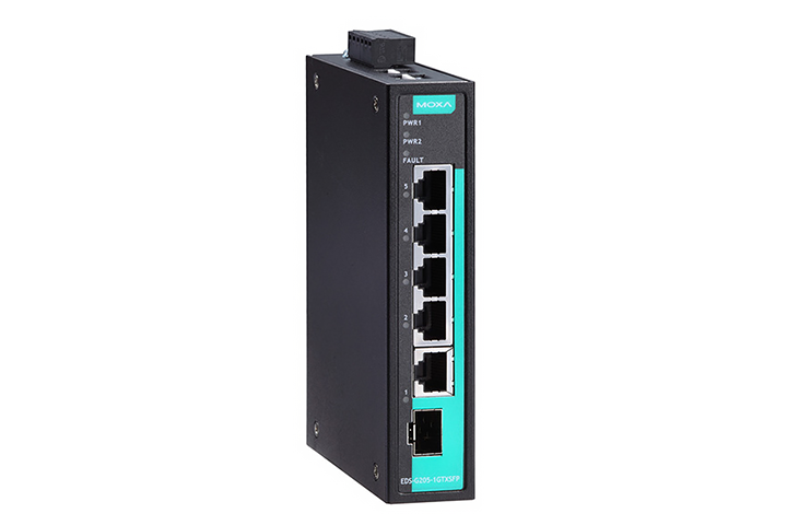 The EDS-G205 Ethernet switches are equipped with 5 Gigabit Ethernet ports and 1 fiber-optic port, making them ideal for applications that require high bandwidth. The EDS-G205 Ethernet switches are built-in relay warning function alerts network managers when power failures or port breaks occur. The 4-pin DIP switches can be used for controlling broadcast protection, jumbo frames, and IEEE 802.3az energy saving. In addition, 100/1000 SFP speed switching is ideal for easy on-site configuration for any industrial automation application.