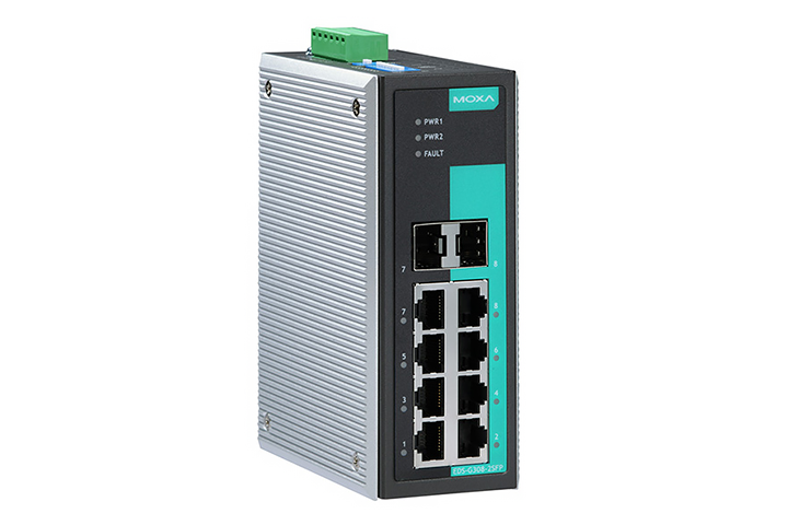 The EDS-G308 Ethernet switches are equipped with 8 Gigabit Ethernet ports and 2 fiber-optic ports, making them ideal for applications that demand high bandwidth. The EDS-G308 switches provide an economical solution for your industrial Gigabit Ethernet connections, and the built-in relay warning function alerts network managers when power failures or port breaks occur. The 4-pin DIP switches can be used for controlling broadcast protection, jumbo frames, and IEEE 802.3az energy saving. In addition, 100/1000 SFP speed switching is ideal for easy on-site configuration for any industrial automation application.
