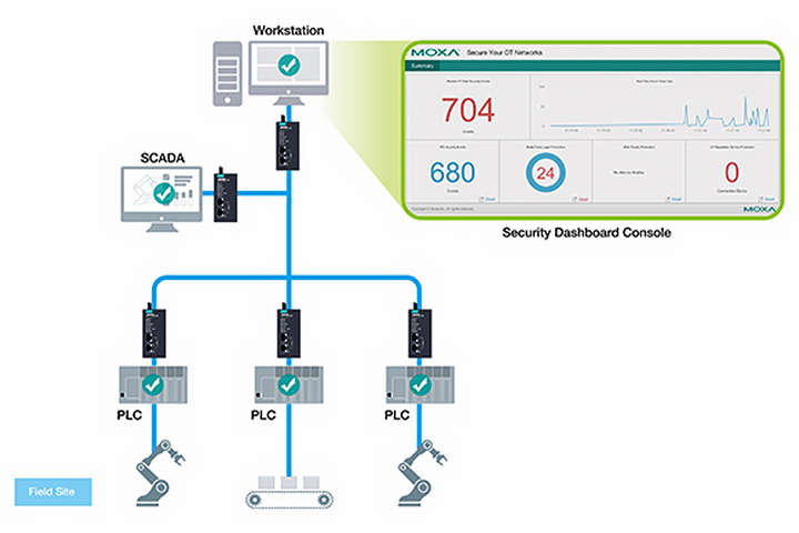 The Moxa IEC-G102-BP Series industrial next-generation Intrusion Prevention System (IPS) devices protect mission-critical assets with industrial-grade IPS and whitelisting. Meanwhile, the Security Dashboard Console (SDC) software, when used together with the IEC-G102-BP Series, offers another layer of protection through centralized critical asset visibility, network analysis, and auto pattern updating.