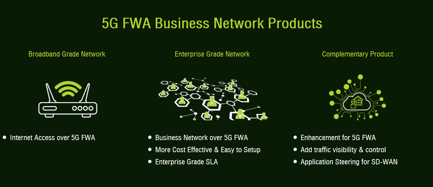 FWA is a solution for excess eMBB capacity and provides greater convenience in setting up high performance and secure enterprise broadband without a regular fiber network.