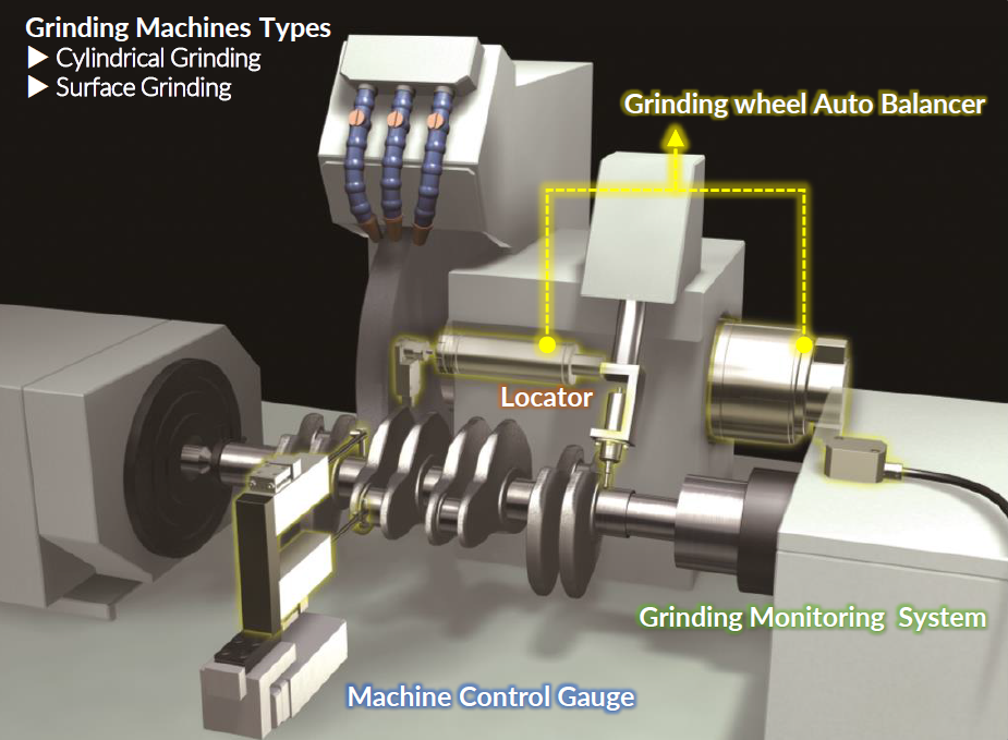 Machine control gauge using in Grinding machine to control grindstone depth of cut speed and Real time workpiece’s size control. Grinding wheel balancer is useful to reduce more than half of normal Grinding wheel exchange time. Grinding monitoring system is useful in the following applications by measuring the acoustic emission signals which is generated by the contact between the grinding wheel (the cutting tool) and workpiece or the dresser, 4 main propose are Gap control, Dressing control, Crash detection and Failure analysis.