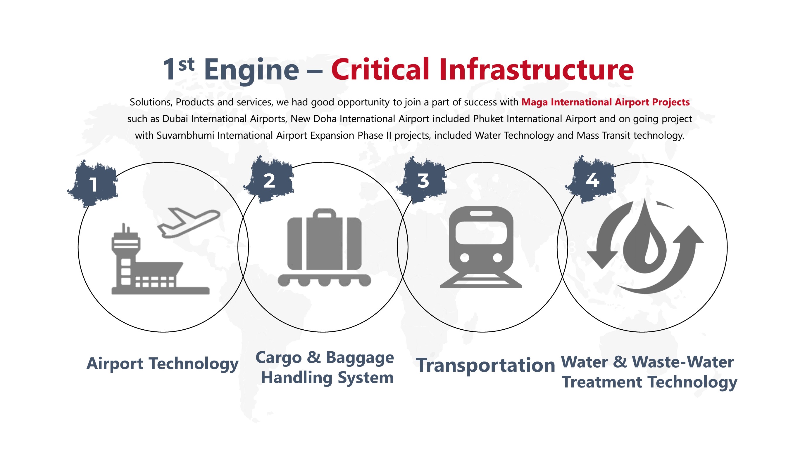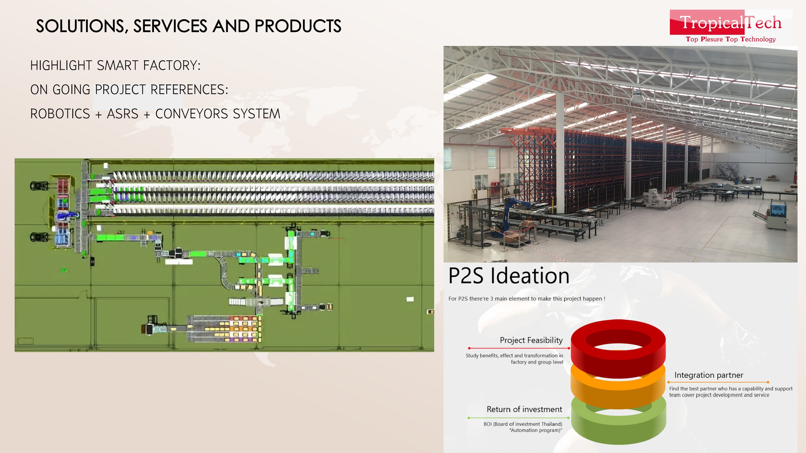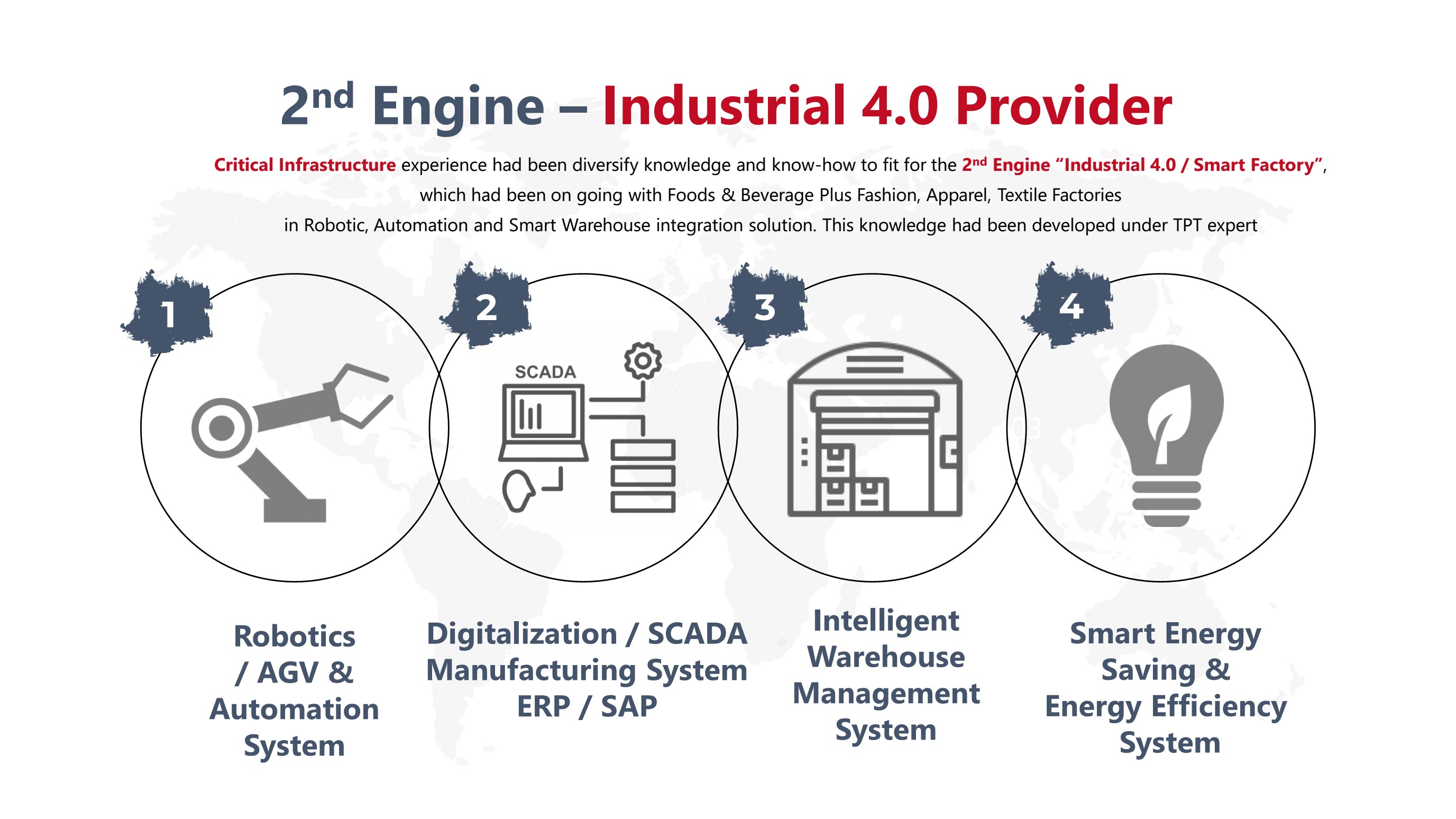 Solutions, Products and services, we had good opportunity to join a part of success with Mega International Airport Projects included Water technology and Mass Transit technic, which be the 1st engine “Critical Infra”, on this experience had been diversify knowledge and know-how to fit for the 2nd engine “Smart Factory”, which had been on going with Foods & Beverage Plus Fashion, Apparel, Textile Factories in Robotic, Automation and Smart Warehouse integration solution.