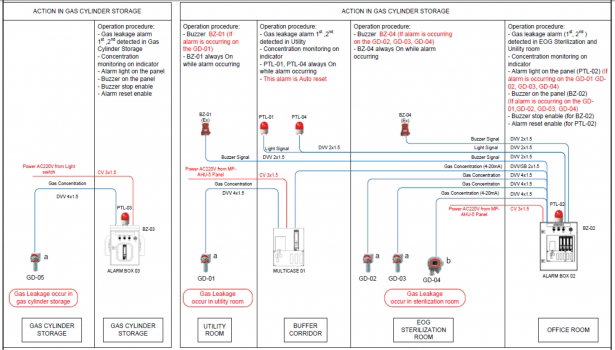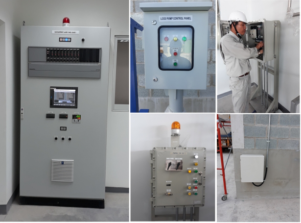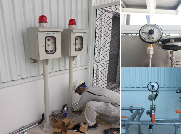 Design and construction of gas warning system connections: sensors, concentration displays, rotating indicator lights, warning panel. Set the setting value for O2 & MIX gas pressure gauges in the alarm cabinet and activate warning signals when pressure drops (rotating indicator light, siren). With in-depth knowledge and experience, we ensure gas pressure levels are reliably and accurately monitored, while ensuring a safe working environment.