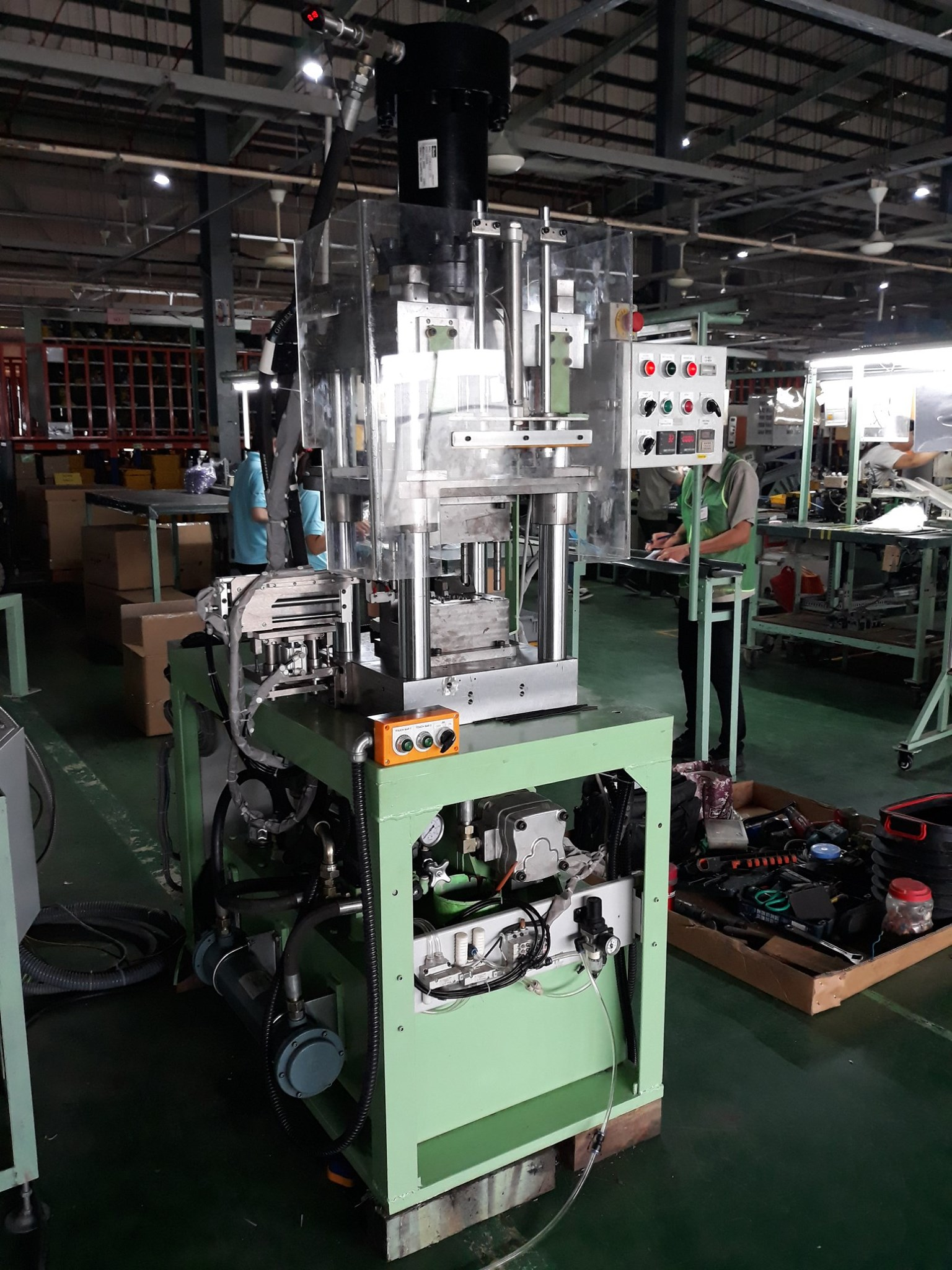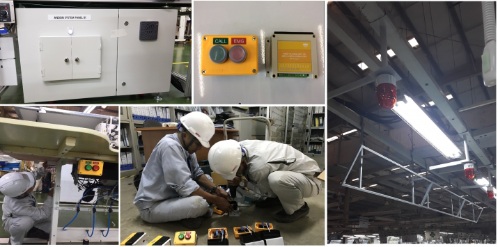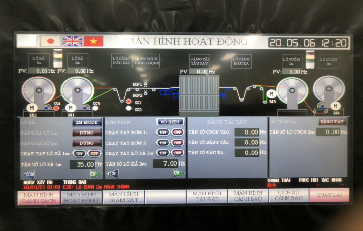 Specifically, we designed two electrical panels sized H1000xW800xD250 and programmed Mitsubishi PLC and applied an E series inverter to control the fabric rolling motor. To ensure the monitoring and connection process, we have developed the GOT 10 HMI interface and use the CC link communication network.