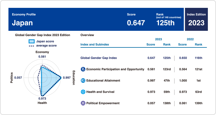 Japan’s Gender Gap Index for 2023 is ranked 125th in the world (source: Global Gender Gap Report 2023)