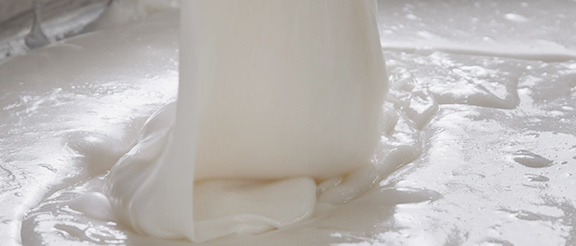 Rice cakes are made by steaming and kneading (left), then combined with cold ice cream (right). The rice cake temperature is key to Yukimi Daifuku’s soft and supple texture, which is the key feature of this popular ice cream.