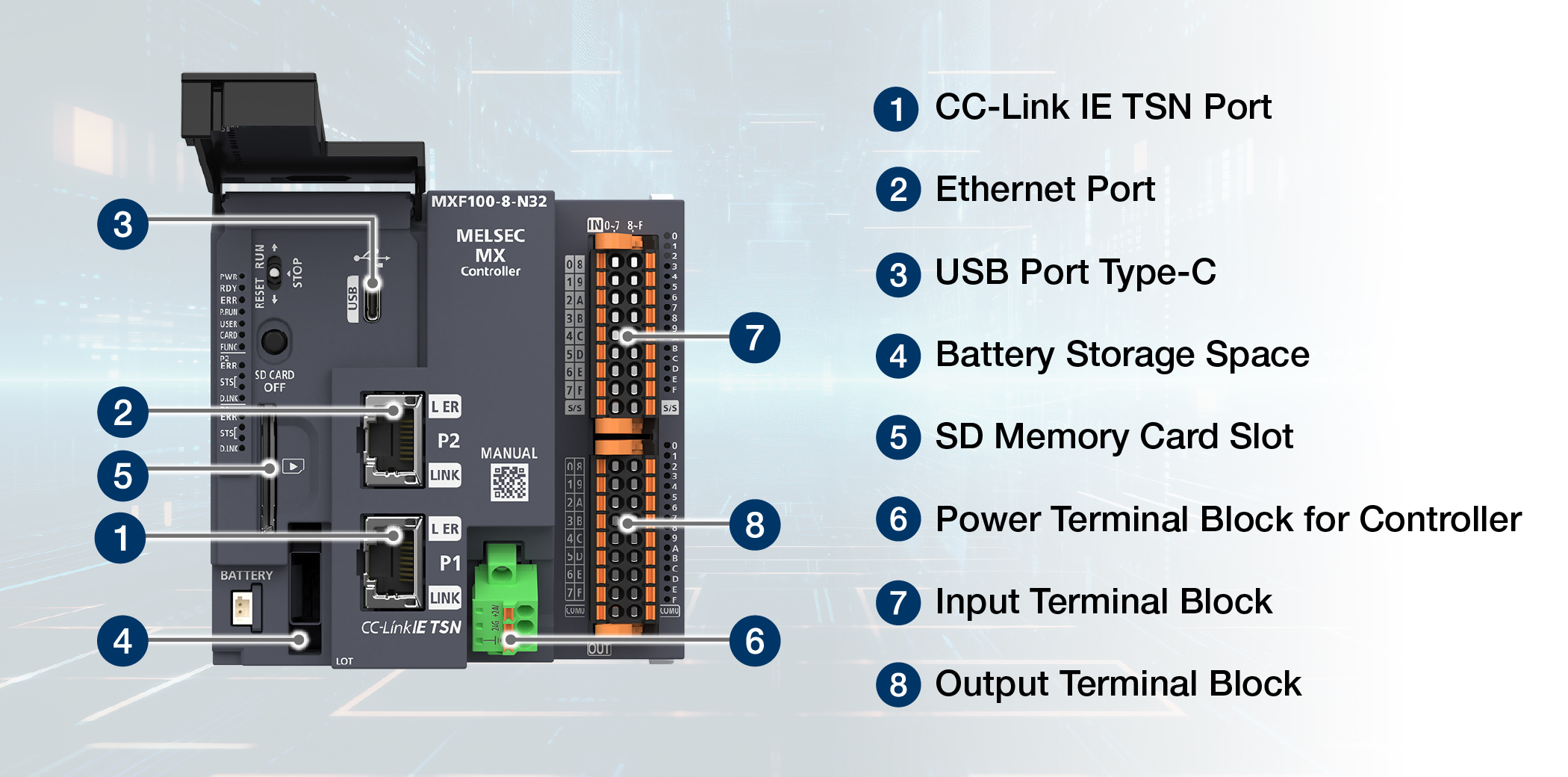 - Equipped with Ethernet port compatible with high-speed, large-capacity CC-Link IE TSN. Achieve large-scale IoT with a compact body.