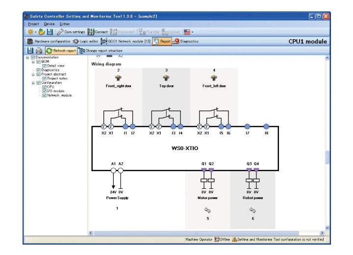 The wiring diagram for I/O modules can be automatically created. Error diagnostics and other reports can be created, printed, and saved as PDF.