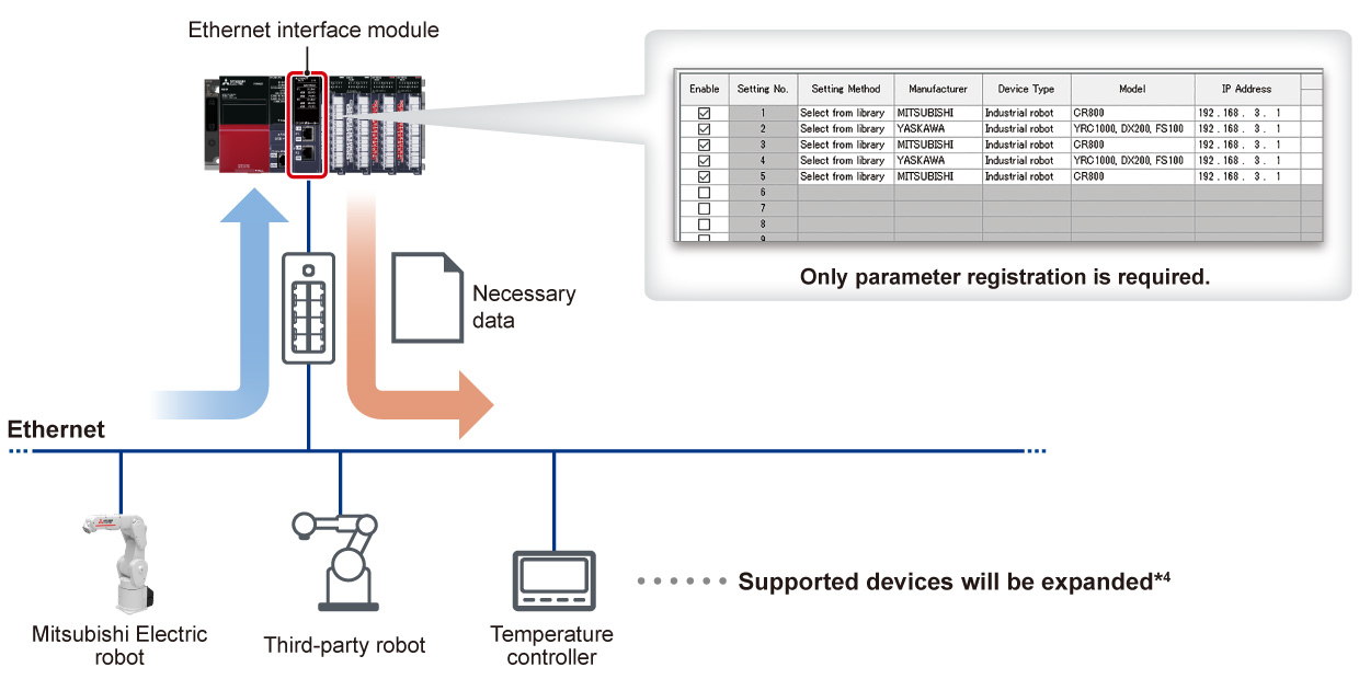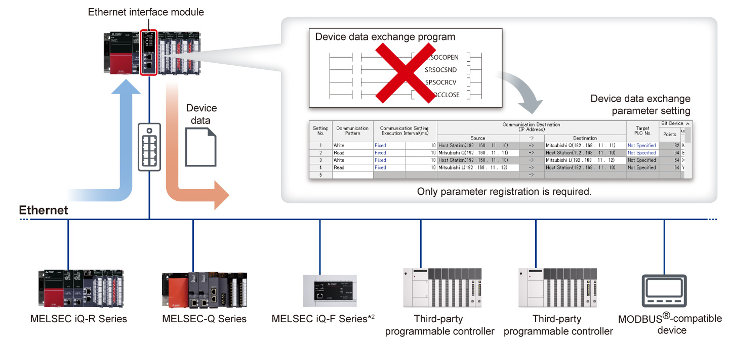 - The Ethernet interface module allows device data exchange by parameter registration with Mitsubishi Electric programmable controllers as well as third-party programmable controllers (simple CPU communication function) *1