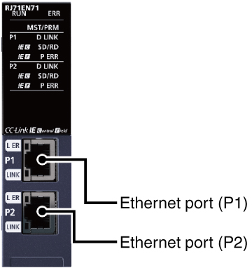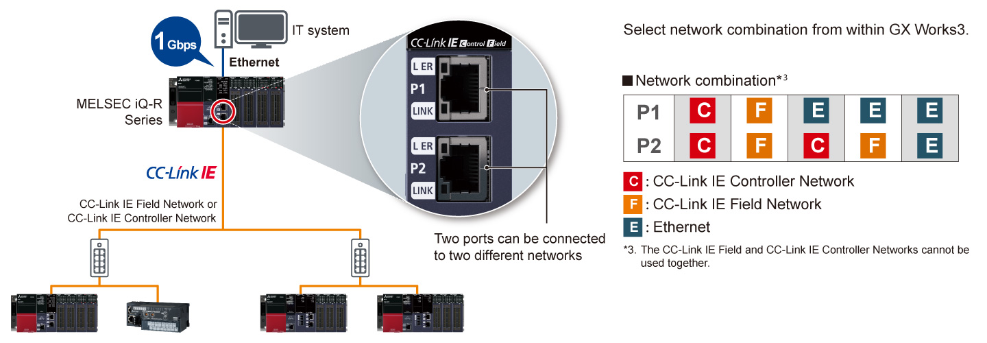 - Equipped with two Ethernet ports, the module enables Ethernet, CC-Link IE Controller Network, and CC-Link IE Field Network communications. Different networks can be simultaneously connected to the two Ethernet ports