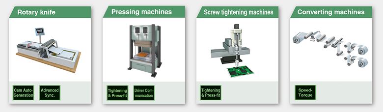 - Wide-range, sophisticated Motion controls, such as advanced synchronous control, cam control, speed-torque control (tightening & press-fit control) can be achieved just with sequence programs including function blocks.