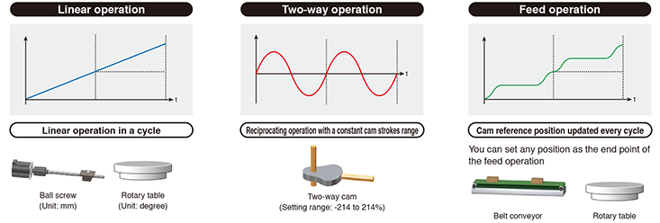 Speed change, Torque change, M-code output function, Digital oscilloscope function, Cam auto-generation function, Target position change function |
