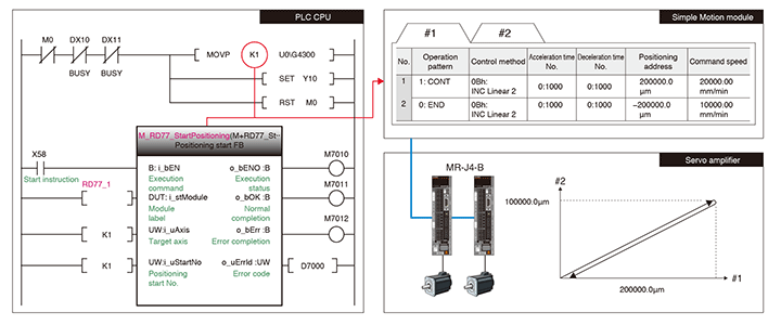 - Automatic operation can be executed easily by setting positioning addresses, speeds, and other setting items in a sequence program.