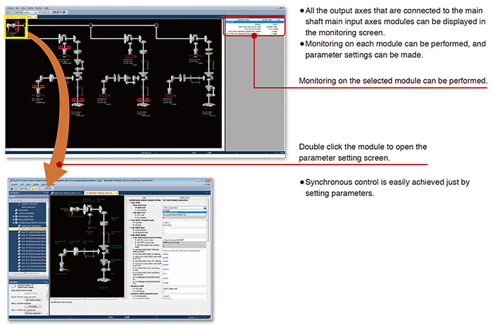 The whole module configuration of the advanced synchronous control can be displayed in one screen, and monitoring of the target modules can be also viewed, which enables more efficient debugging.