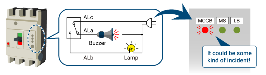 When a circuit breaker is tripped, an alarm triggers by means of a lamp, buzzer, or other signal.