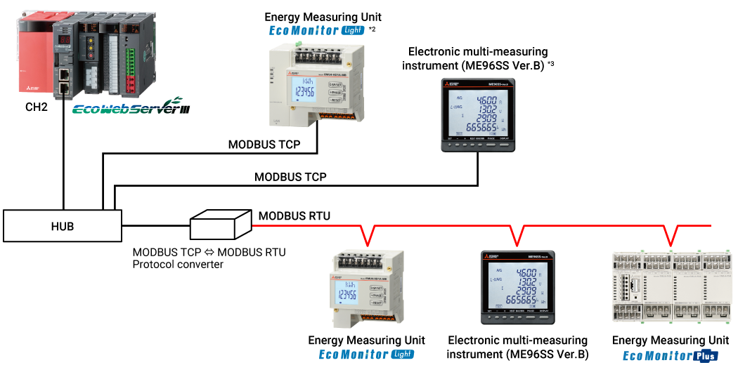(As with the case of MC protocol communication) - Using the LAN CH2 of EcoWebServerIII, via MODBUS TCP ⇔ MODBUS RTU converter, realize MODBUS RTU communication. *1