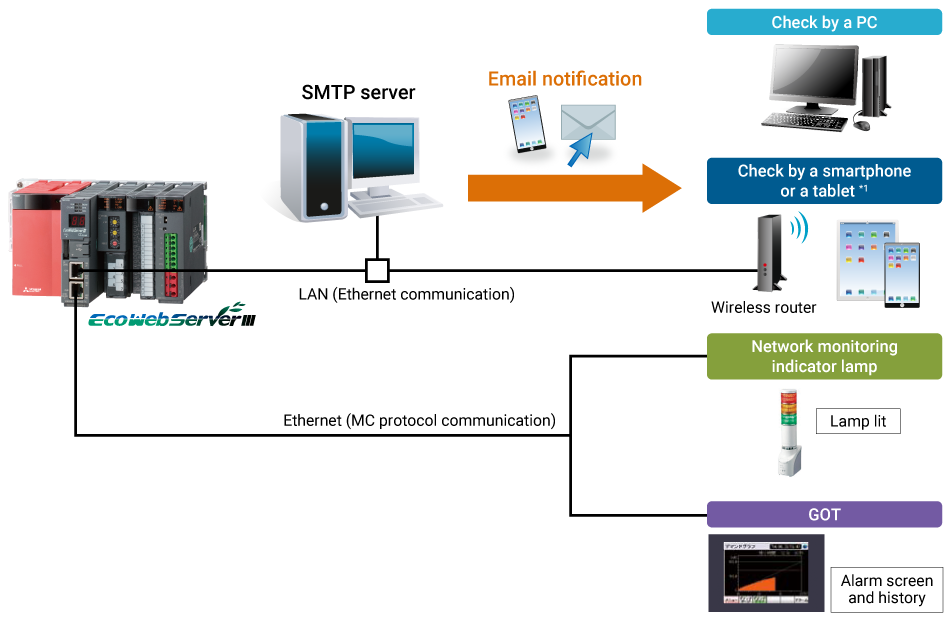 - It is possible to send an email notification and an alarm output in case of the occurrence of target excess or facility abnormality, so you can catch a condition change at once. It is possible to accelerate the PDCA cycle from problem finding to measure taking and improve the productivity.