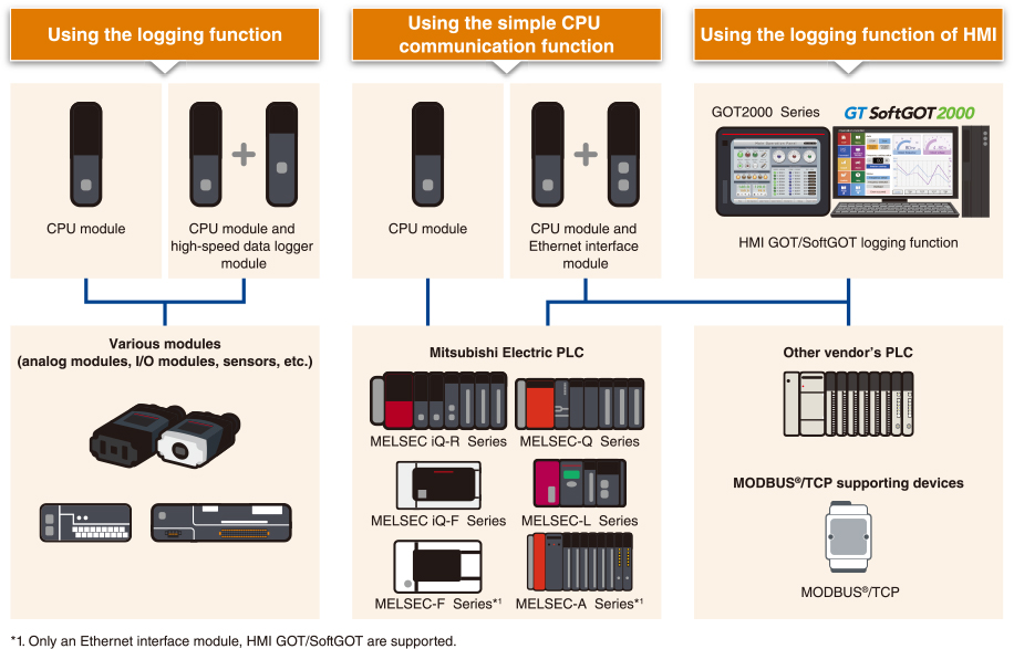Collecting data from various devices and Other vendor's PLC with the logging function and the simple CPU communication function.