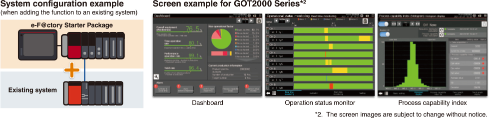 The e-F@ctory Starter Package includes a lot of projects file for the MELSEC iQ-R/iQ-F Series PLC*1 and the GOT2000 Series human-machine interface. Programs for visualization and simple analysis are provided in sample project format, allowing IoT to be integrated at the shop floor with basic settings such as device assignment and parameter registration. The e-F@ctory Starter Package removes issues that come with IoT system integration, such as time that spent on evaluating options or budget requirements.
