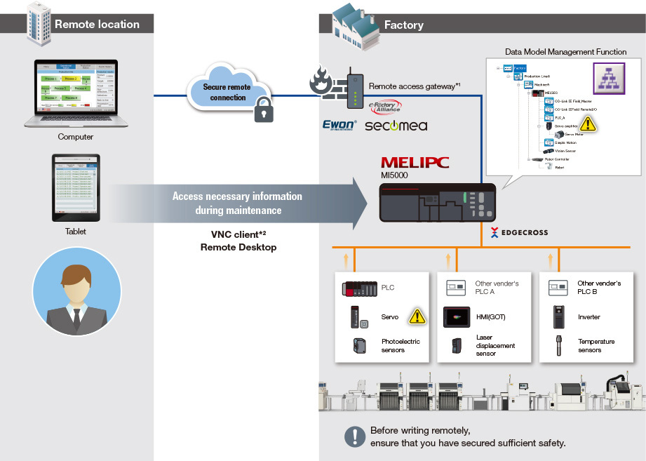 (2) The Edgecross data model management function enables the user to narrow down to the target equipment, ascertain the current status, and perform maintenance from a remote location.