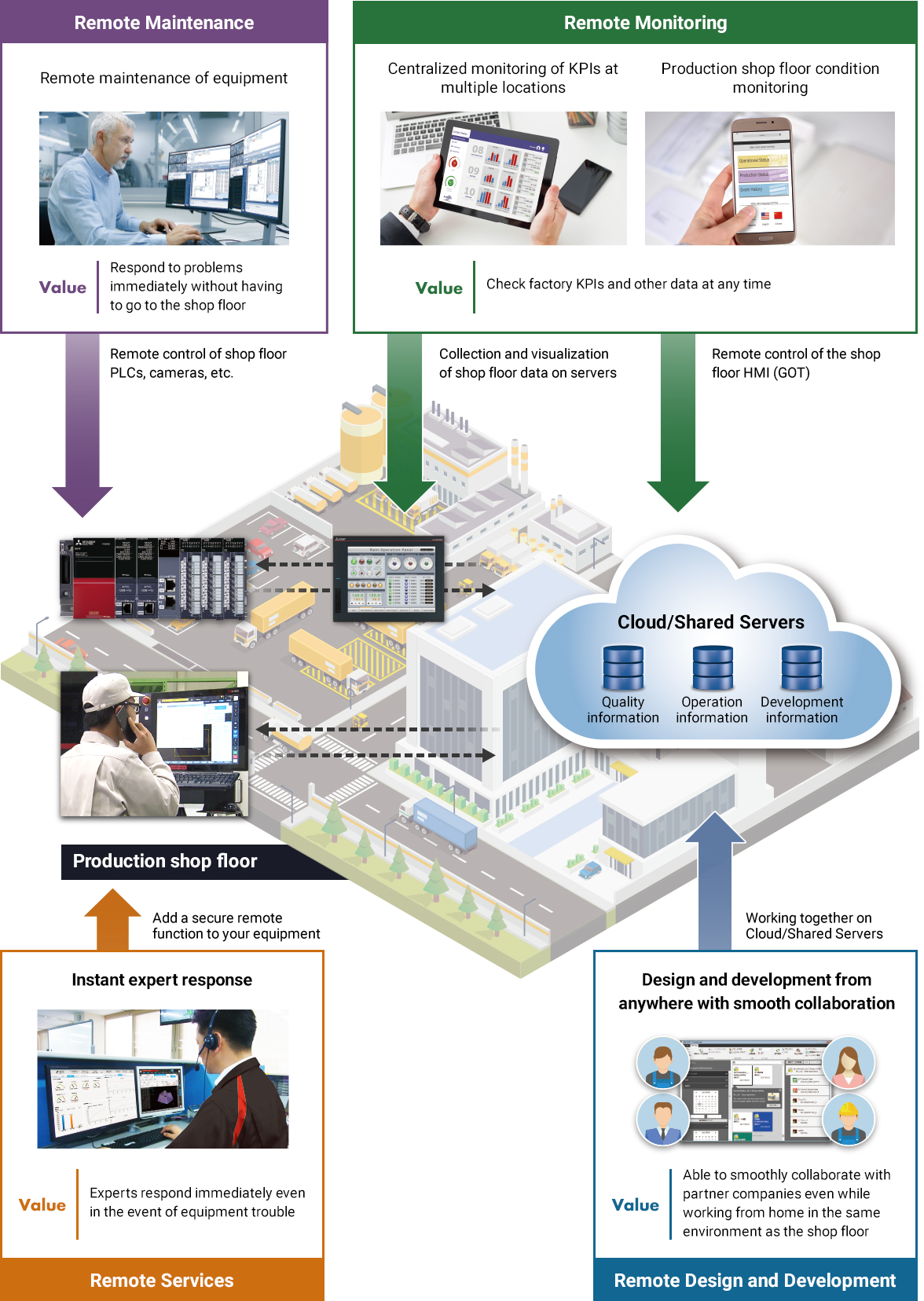 Mitsubishi Electric's FA remote solutions facilitate the diversification of work styles and contribute to improving the competitiveness of all companies involved in monozukuri.