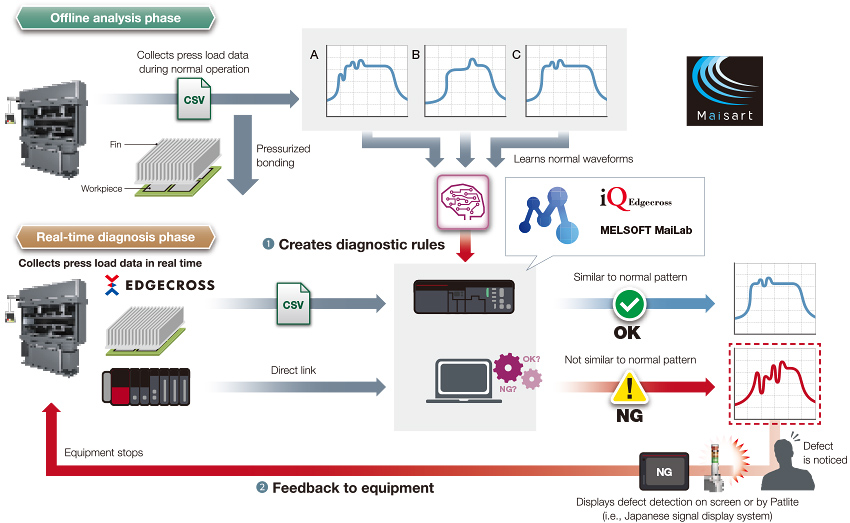 Press load data is collected in real time by the MELIPC industrial-use PC and then diagnosed based on rules using MELSOFT MaiLab, allowing for bonding defects to be detected, which are then fed back to the equipment (causing equipment to stop).