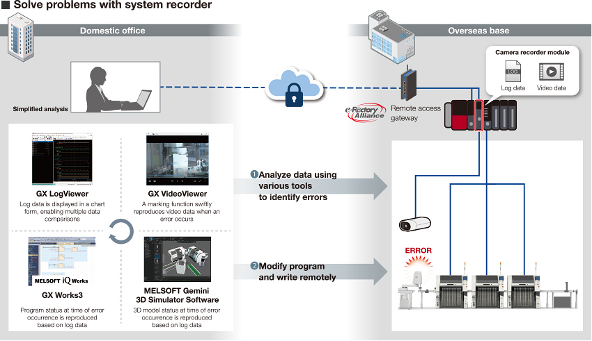 The system recorder*1 performs system-wide recording of equipment operation data and camera images in the event of an abnormality. Waveform data, programs, and video data of the shop floor are obtained at remote locations, and operations can be confirmed through these data by linking 3D simulator and other tools. Remote environments are easily and securely built using Ewon/Secomea remote solutions.