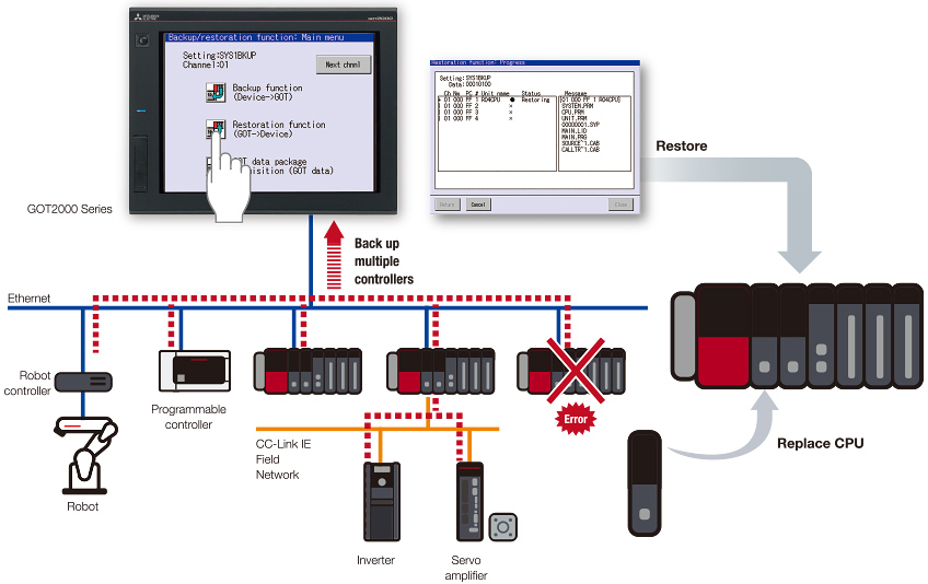 The GOT Backup/Restoration function allows users to back up programs and parameters of FA devices such as PLCs to a GOT SD memory card or USB memory. Programs and parameters can be easily restored from GOT to FA devices when the devices need to be replaced.