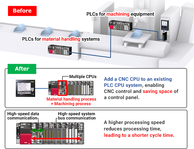 | Improving cycle time and reducing control panel size through space saving by controllers(PLCs/CNCs) | Configure a multiple CPU system by PLC CPUs and CNC CPUs. |