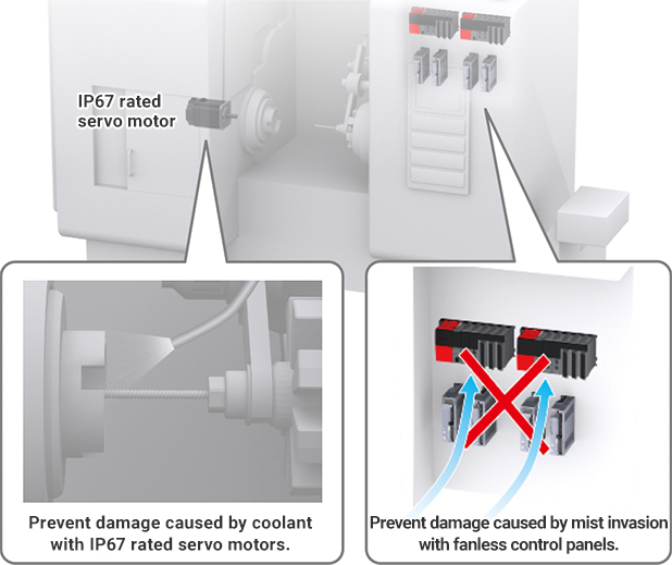 | Preventing damage to servo motors caused by coolant during machining | Enhance water resistance with IP67 rated servo motors and fanless control panels. |