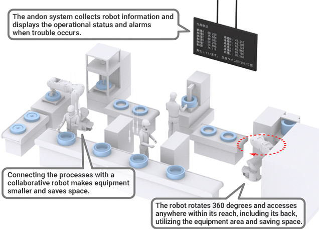 | Reducing equipment size and visualizing trouble | Combine processes with the collaborative robot, MEFA, and collect interlock signals in an andon system. |