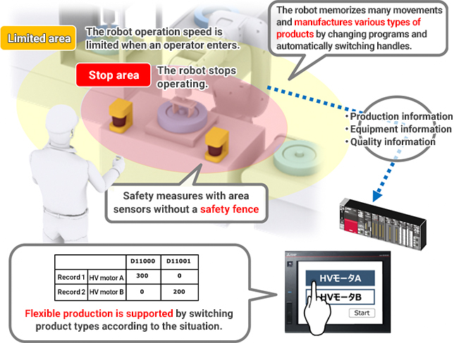 | Configuring a production line that manufactures products flexibly according to the production status and that does not require a safety fence | Cooperate with FA products and support human collaboration using area sensors. |