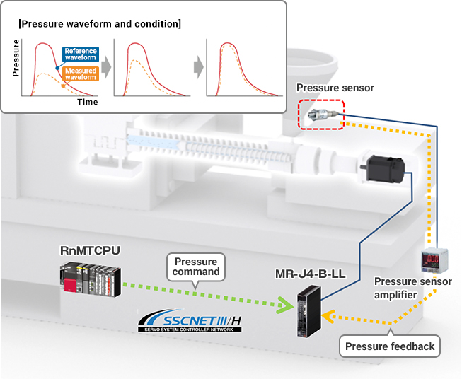| Improving the product quality by controlling the molding pressure in real time | Perform a high-response pressure control with servo amplifiers supporting pressure control. |