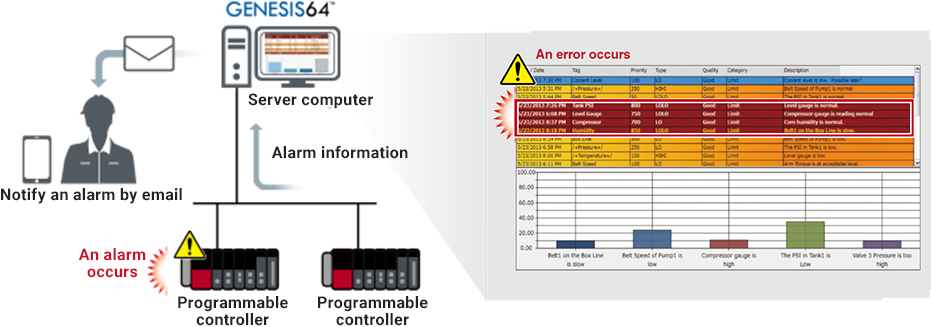 From the various data accumulated on the server, GENESIS64 can automatically output forms for various periods of time (daily reports/weekly reports/monthly reports/yearly reports, etc.) and each piece of equipment. In addition to Excel®, files can be outputted in HTML or PDF, and users can choose the display method of their choice from a variety of tables and graphs.
