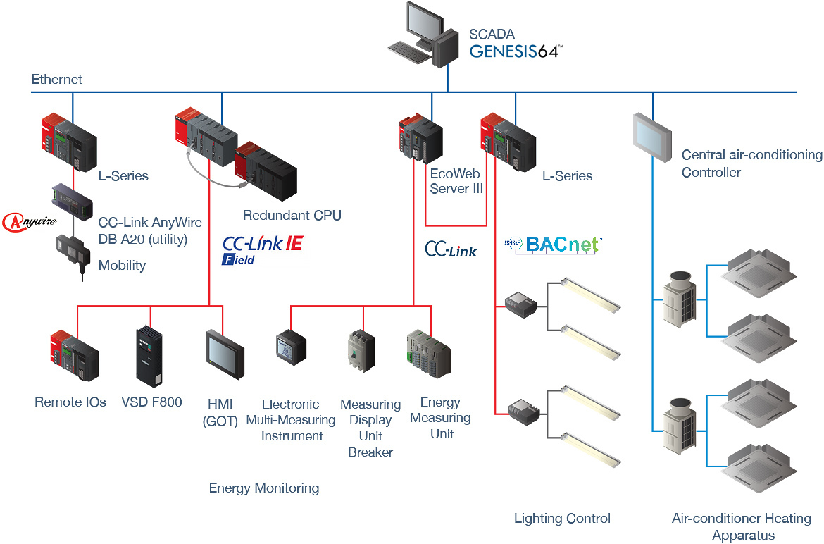 Whether it is for hospitals, commercial buildings or factories, visual representations of energy consumption are needed to inform operators if the system is functioning correctly. Mitsubishi Electric's SCADA GENESIS64™ serves this purpose and presents clear, easy-to-understand graphical onscreen illustrations.